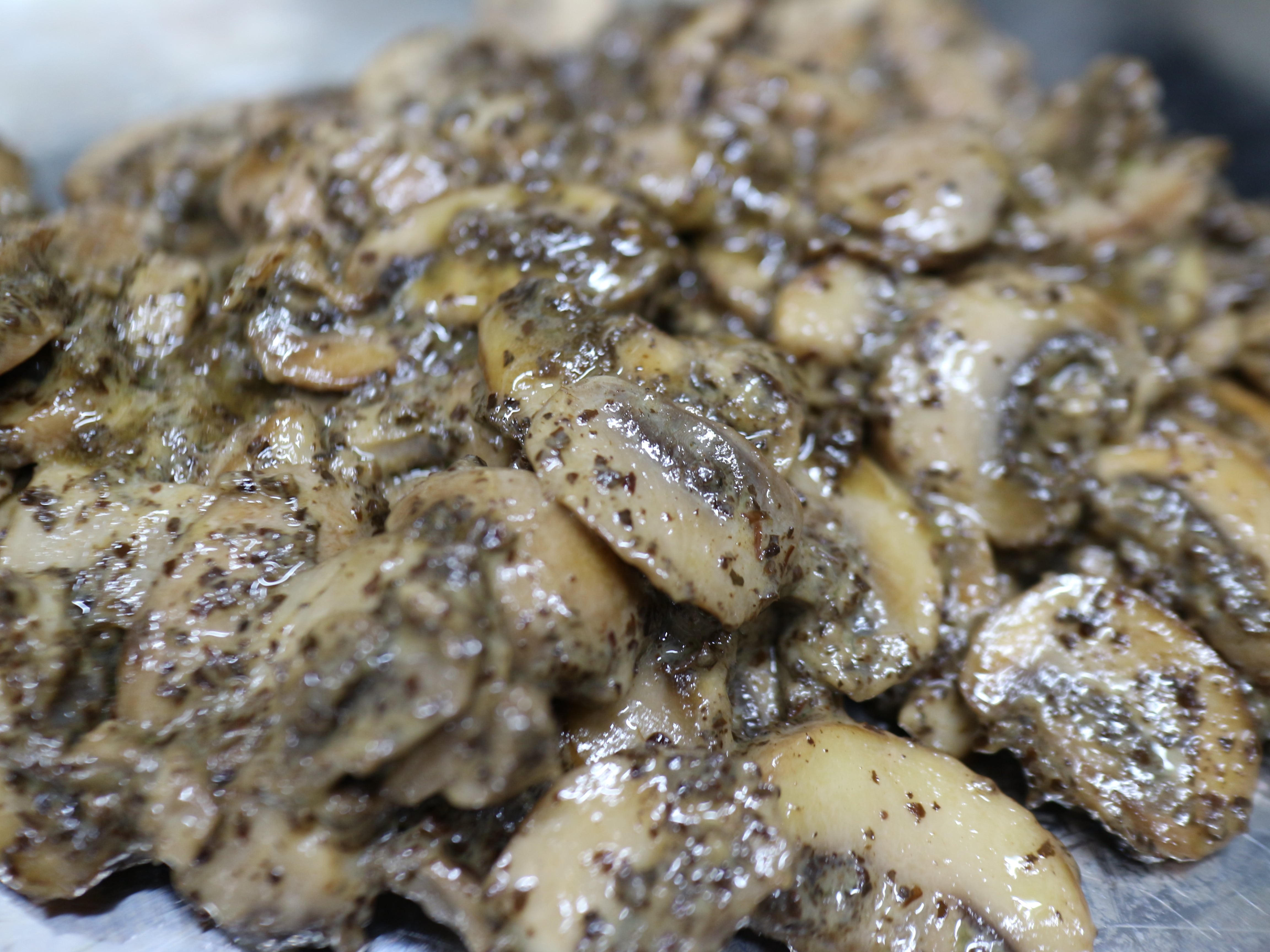 ブラウンマッシュルームをバターで丁寧にソテーし、アールグレイと生クリームで煮詰めた自家製ピューレに、マロンとトリュフオイルを重ねて。