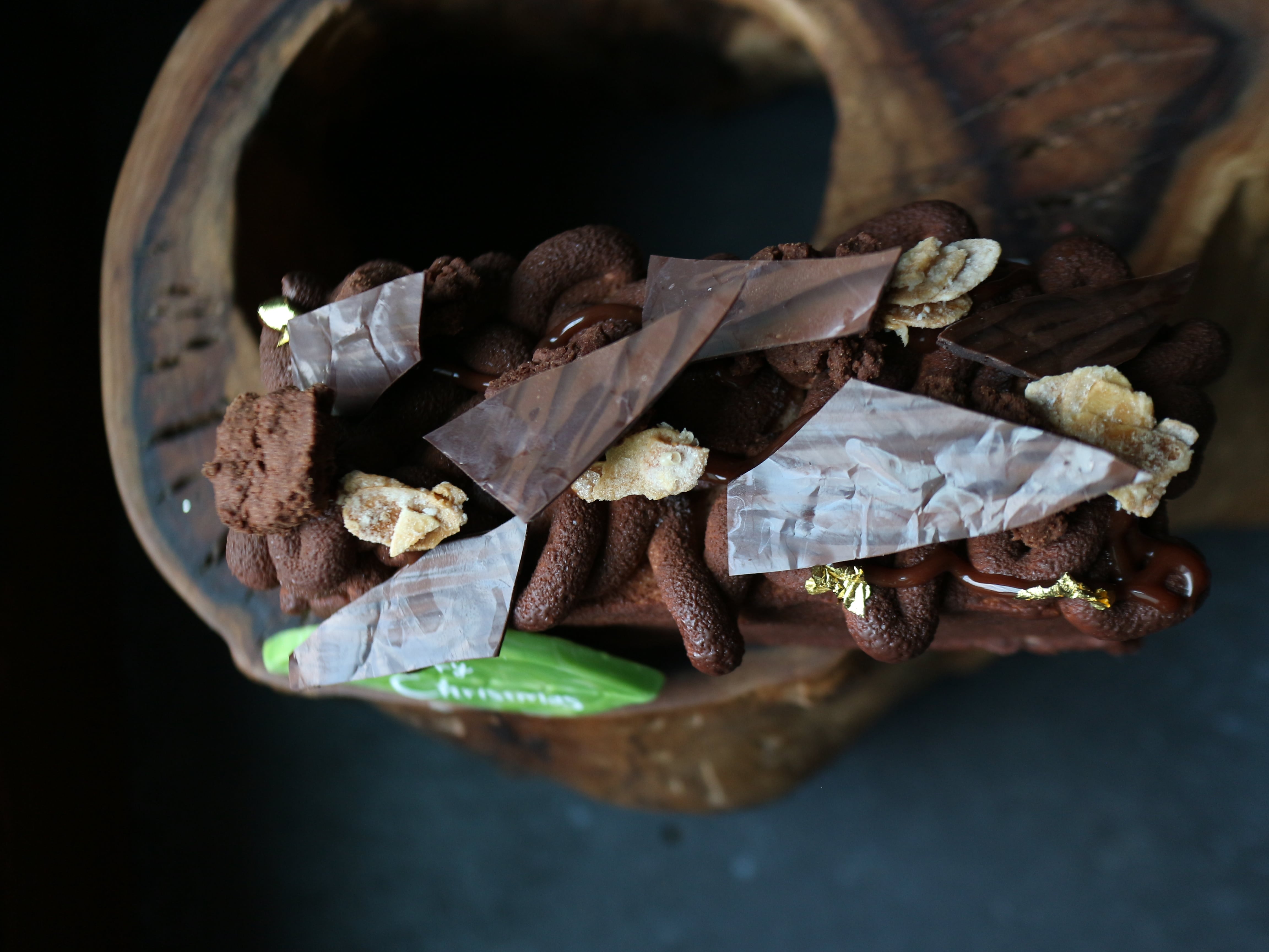 冷たく静かな冬の森の中で息づく命。凍てつく空気に包まれながら、力根を強く張り静かに息をする木々。そんな命の息吹を感じさせるケーキです。樹皮のような質感のダークチョコレートの層に、深く伸びる根のようなチョコレートソースを絡ませ、雪の降り積もる中に佇む小石や枝をアーモンドスライスやカカオニブで、静寂の中に煌めく雪の粒のように、冬の夜空に反射する光を金箔で表現しました。フランス産65%ダークチョコレートを使用した濃厚なブラウニーに、アッサムティー香るミルクチョコクリーム、そしてラズベリーとクランベリーのコンフィチュールを合わせチョコレートでコーティングしました。カカオクランブルとアーモンドスライスの香ばしい食感が調和する、冬だけの特別なショコラをお楽しみください。