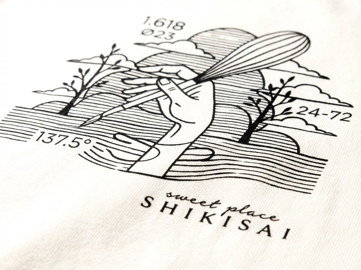 A. 胸元に刻まれた3つの数字(1.618 / 24-72 / 137.5°)の意味を解説したカードです。このTシャツの背景にある思想を、より深く理解していただけます。
