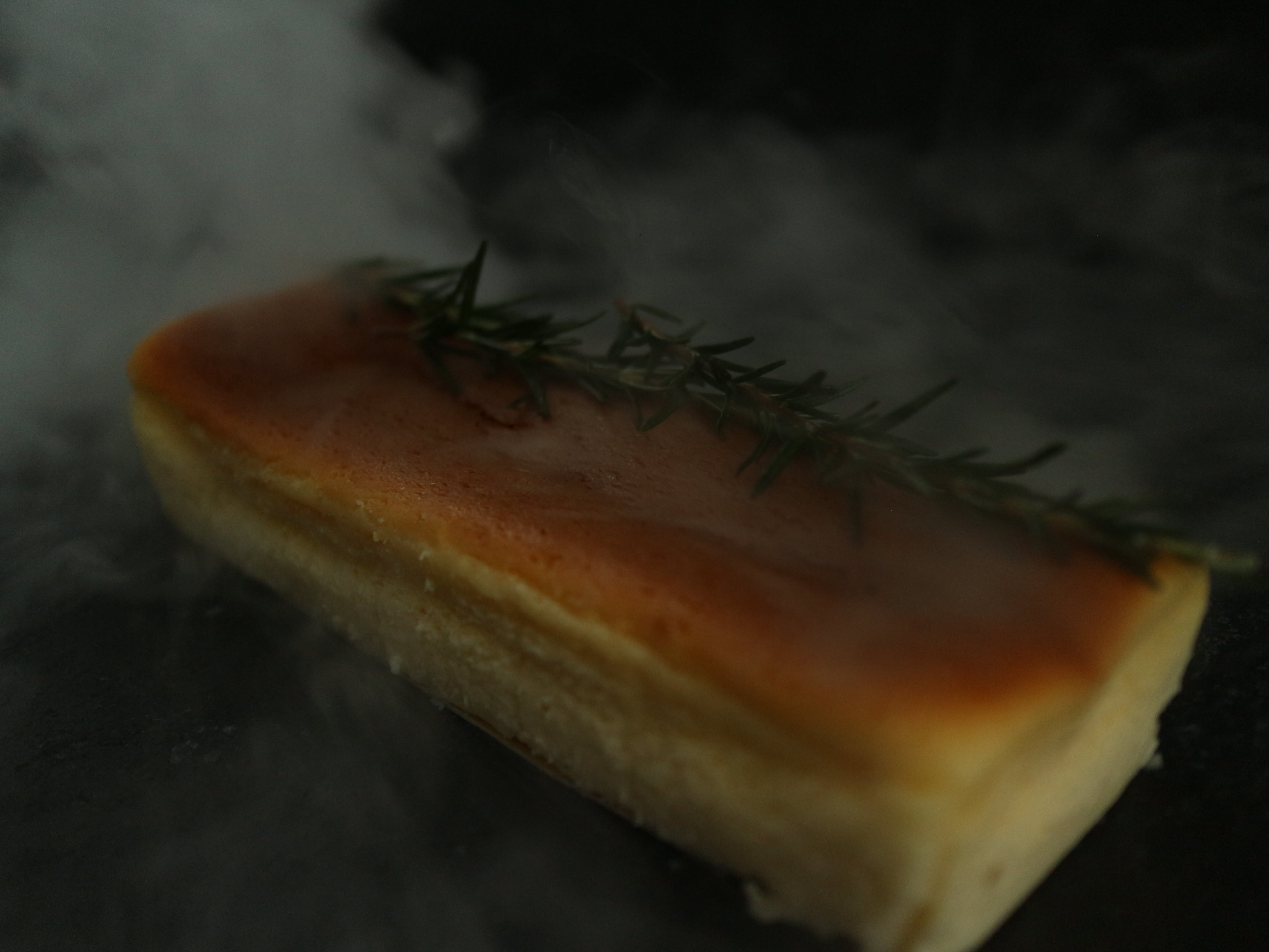 湯煎焼きしたチーズケーキの焼き面にローズマリーの薫煙を纏わせ、よりチーズのコクをより引き立てます。焼き方にもひと工夫。半分湯煎で焼き上げることで、表面はしっかりとしたベイクド食感、中心はしっとりとしたレアな食感を両立。温度によって変化するチーズの味わい、薫製の香りをお楽しみください。